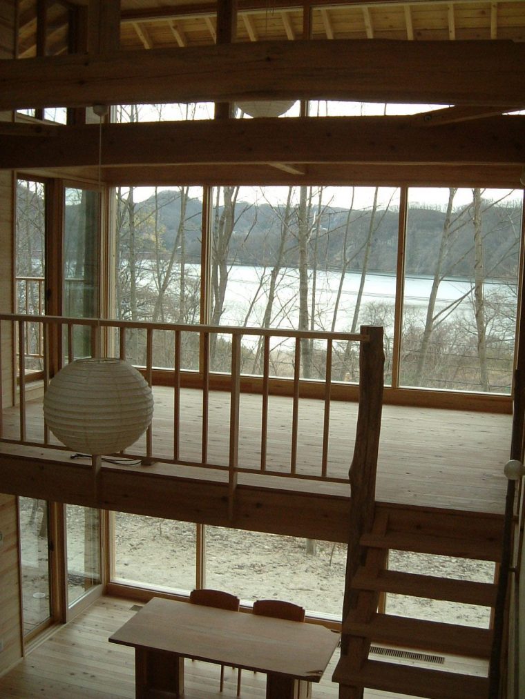 モデル住宅は、当初は南側の面は二本の柱で支える予定でしたが、高さ40センチの断面の取れる樅ノ木の丸太を見つけたので、2間半を柱なしの構造とし、大きなガラス面を実現することができました。